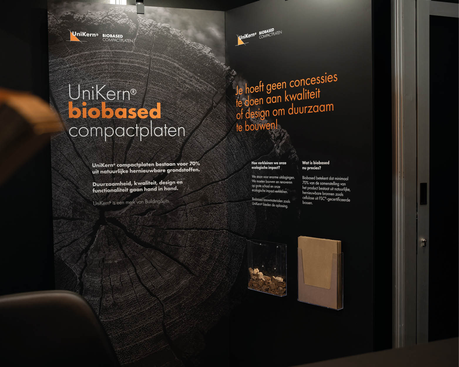 Deze eigenschappen vormden de basis voor het verhaal én de visuele stijl. Voor de Bouwbeurs ontwikkelden we een krachtig beursconcept, waarin biobased de hoofdboodschap was. Met een uitgesproken stijl; veel zwart, grafische contrasten en beeld van bomen – wisten we een kleine stand een grote opvalwaarde te geven. De stand werd gebouwd door BuildingSuits zelf, met UniKern compactplaten als tastbaar bewijs van het product.